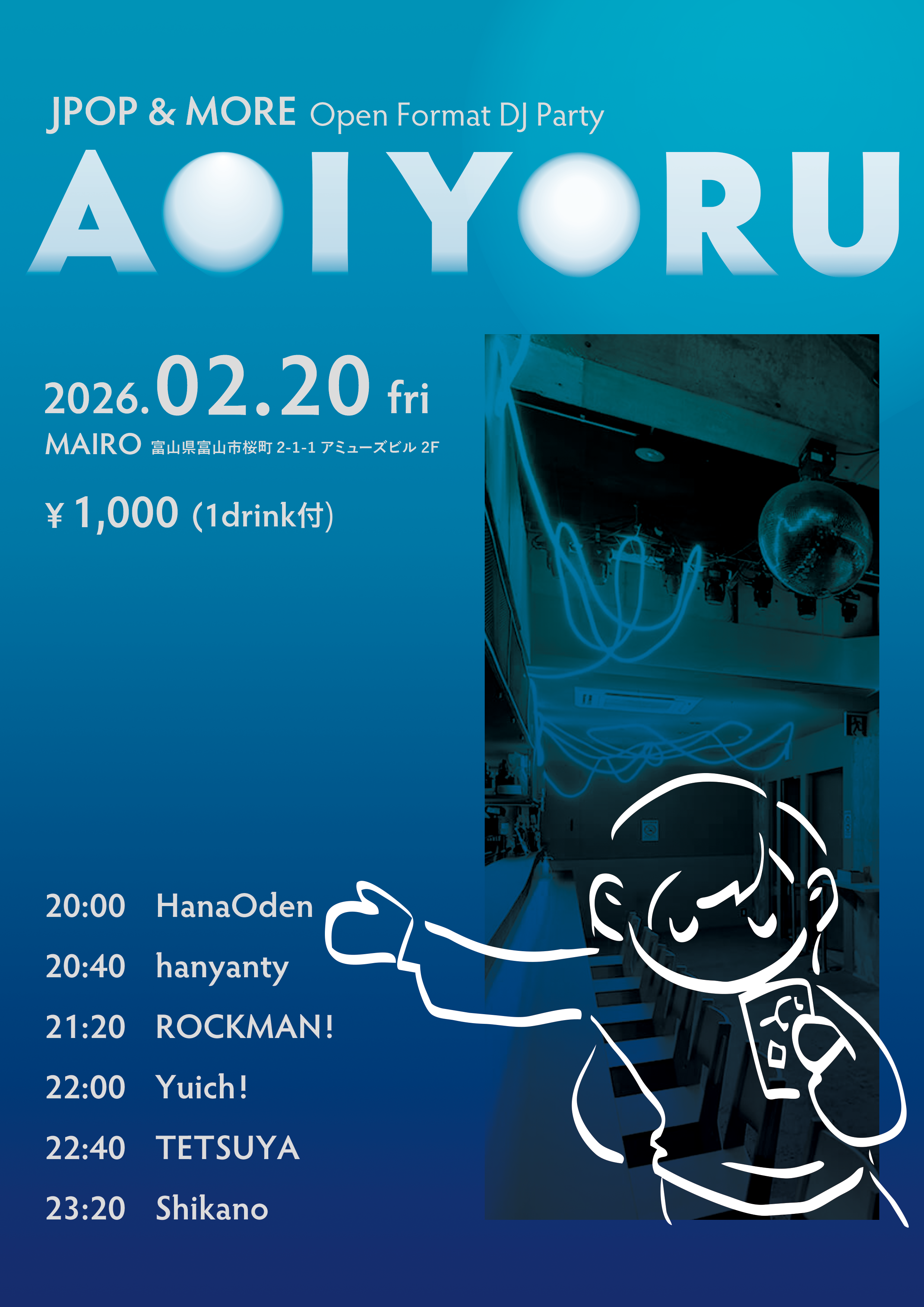 富山の週末を美味しいお酒とGood Musicで彩るDJイベント「AOIYORU」の主催。